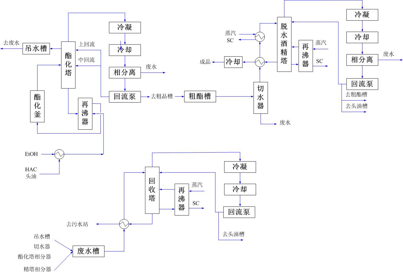 乙酸乙酯的生產過程包括:配料、酯化、分相、脫水、精制、回收等步驟。乙酸與乙醇按一定比例混合進入酯化釜內,然后向酯化釜加入濃硫酸催化劑進行酯化反應,反應后的產物進入酯化塔,汽相的乙酸乙酯和水經塔頂冷凝器冷卻后進入分相器分相得到粗酯。粗酯再經過脫水塔系統(tǒng)、精餾塔系統(tǒng)得到成品乙酸乙酯。與此同時回收塔系統(tǒng)對廢水中的酯、醇進行回收。回收后的酯、醇去配料。